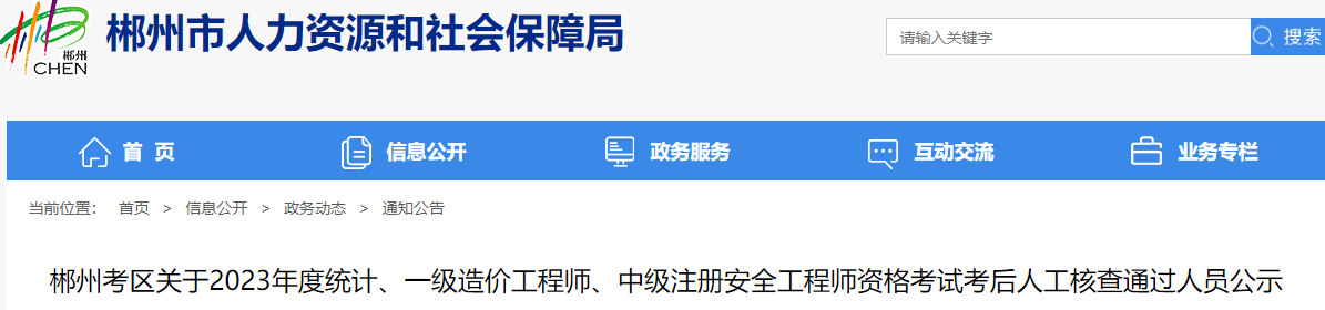 郴州市人力资源和社会保障局发布了《郴州考区关于2023年度统计、一级造价工程师、中级注册安全工程师资格考试考后人工核查通过人员公示》,其中明确郴州市一级造价师考后审核已于1月11日完成,人员名单公示时间为1月15日至19日。