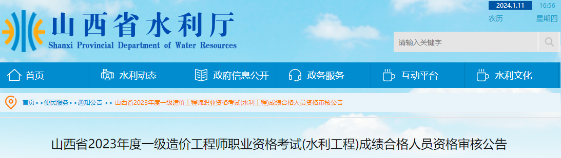 近日,山西省水利厅发布了《山西省2023年度一级造价工程师职业资格考试(水利工程)成绩合格人员资格审核公告》可知,2023年山西一级造价师水利工程成绩合格人员需进行考后审核,审核时间为2024年至1月9日至12日。