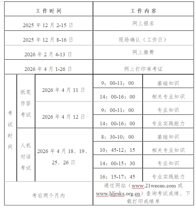 报考人员按规定时间登录“考生管理平台”,打印准考证。打印后,请仔细核对准考证上各项信息,如有问题需在准考证打印截止日期前与报名市(地)考试机构联系,咨询电话详见黑龙江省人事考试网“联系方式”栏。