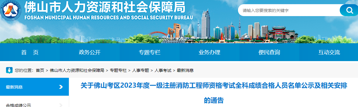 根据《人力资源社会保障部办公厅关于印发<专业技术人员职业资格考试考务工作规程>的通知》(人社厅发〔2021〕18号)、广东省人力资源和社会保障厅办公室《关于印发实行告知承诺制证明事项清单的通知》(粤人社办〔2021〕8号)及相关要求,现对佛山考区2023年度一级注册消防工程师资格考试全科成绩合格人员予以公示,共90人(详见附件)。