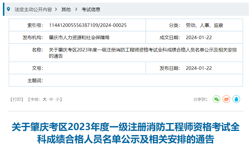 肇庆市人力资源和社会保障局发布了《关于肇庆考区2023年度一级注册消防工程师资格考试全科成绩合格人员名单公示及相关安排的通告》,其中明确该市共有15人取得一级消防工程师合格成绩,并对相关人员信息予以公示。