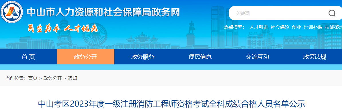 中山市人力资源和社会保障局政务网发布了《中山考区2023年度一级注册消防工程师资格考试全科成绩合格人员名单公示》,其中明确该地共有42人取得一级消防工程师合格成绩,相关人员信息公示截止时间为2月2日。