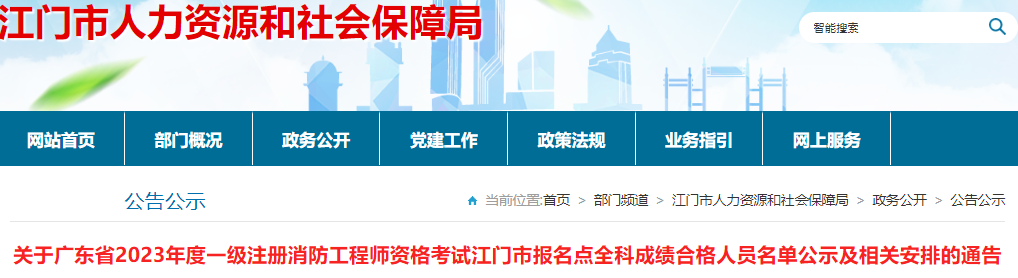 2024年1月22日,江门市人力资源和社会保障局发布了《关于广东省2023年度一级注册消防工程师资格考试江门市报名点全科成绩合格人员名单公示及相关安排的通告》,其中明确江门市共有29人取得一级消防工程师合格人员,并对相关人员信息予以公示。