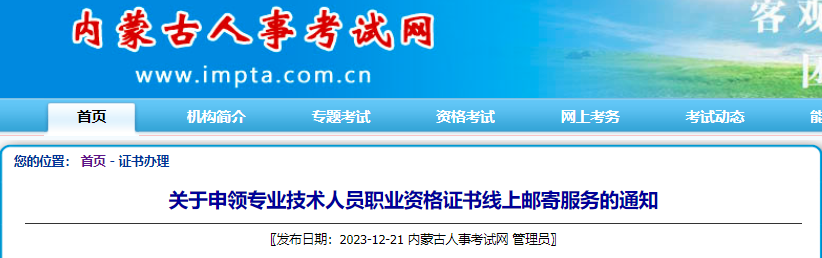 为落实政务服务便民需求,切实提升服务水平。我院对“内蒙古自治区电子证书管理系统”进行了升级完善,并与中国邮政速递物流股份有限公司内蒙古自治区分公司对接,对在我区参加考试并取得的专业技术人员职业资格证书的考生提供“线上申请,线下寄递”的便捷服务。现将具体事宜通知如下: