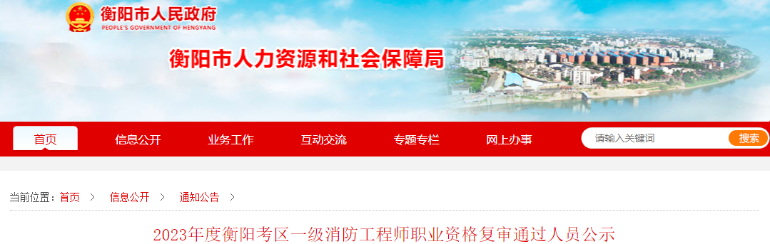 2024年2月1日,衡阳市人力资源和社会保障局发布了《2023年度衡阳考区一级消防工程师职业资格复审通过人员公示》,其中明确该地共有6人进行一消考后审核,审核结果公示时间为2月1日至7日。