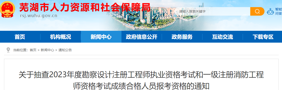 芜湖市人力资源和社会保障局发布了《关于抽查2023年度勘察设计注册工程师执业资格考试和一级注册消防工程师资格考试成绩合格人员报考资格的通知》,其中明确芜湖市部分一消成绩合格人员需进行考后审核,审核材料需在1月31日前提交。