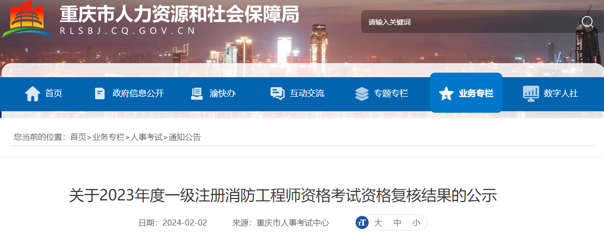 2024年2月2日,重庆市人力资源和社会保障局发布了《关于2023年度一级注册消防工程师资格考试资格复核结果的公示》,其中明确重庆市一级消防工程师考后审核已结束,审核结果公示时间为2月2日至20日。