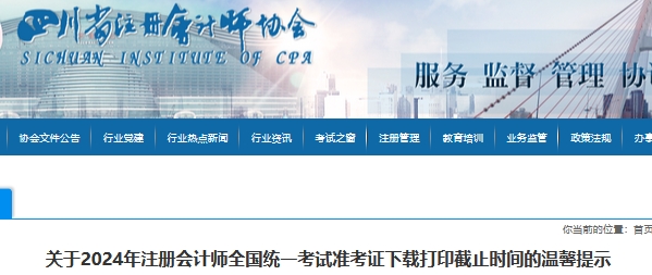 2024年注册会计师全国统一考试准考证打印时间为8月5日至8月20日(每天8:00——20:00)。8月20日20:00后,准考证下载打印窗口将关闭,未下载打印准考证的考生不能参加考试。