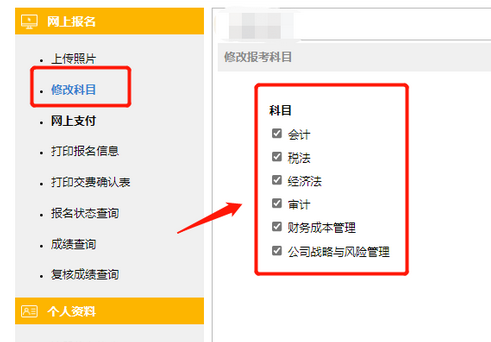 第二步:进入报名系统后,在导航栏点击"修改科目“一栏,点击之后可以对所有报考科目进行调整——可增加,可减少。