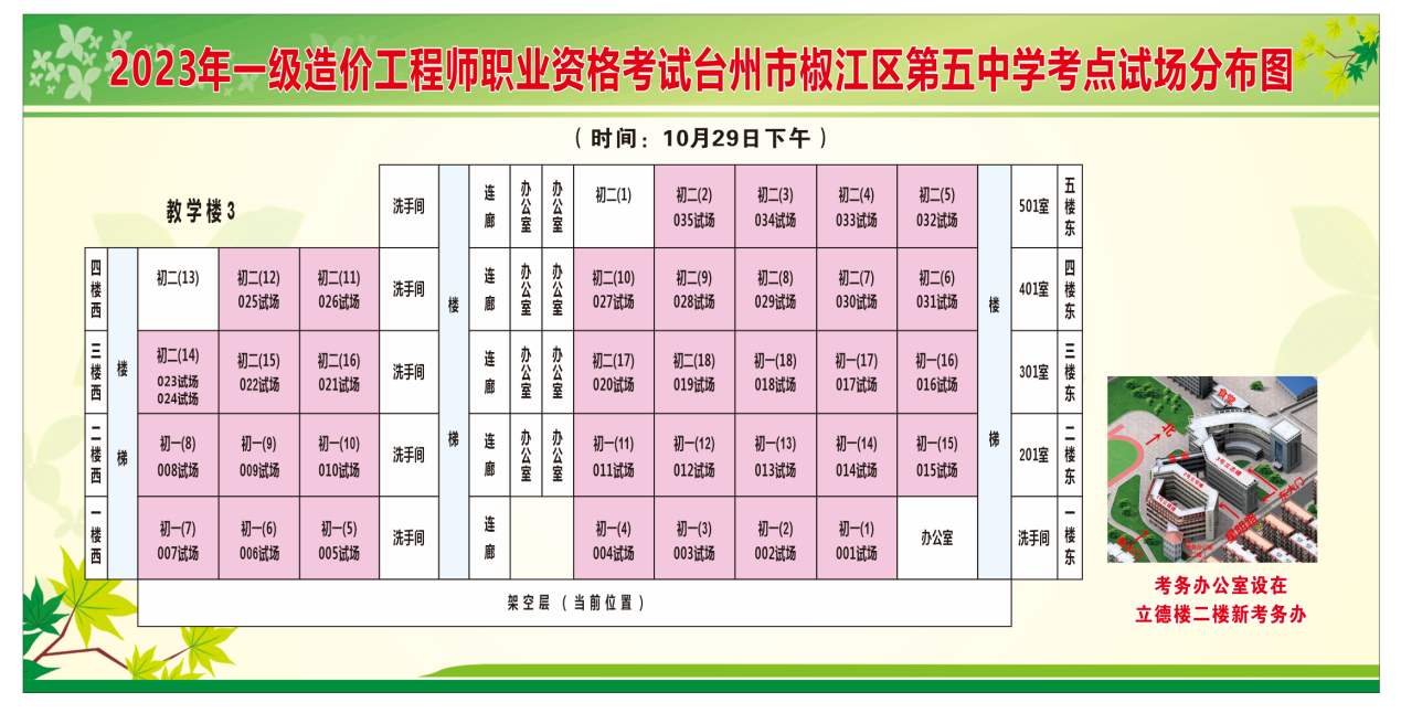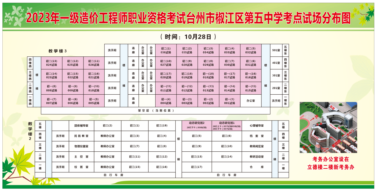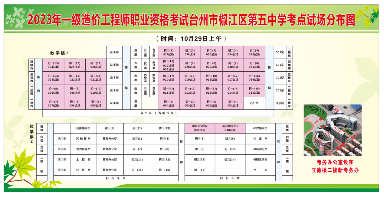 2023年10月26日,台州人社公众号发布了《这两项考试本周末开考,准考证已开放打印,内附考场示意图》,其中明确台州市2023年一级造价师考试在10月28日-29日举行,该考试设台州市椒江区第五中学1个考点。