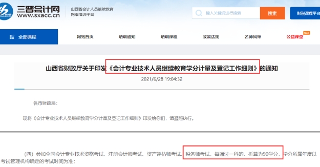 天津:参加会计专业技术资格考试(非天津考区)、审计专业技术资格考试、经济专业技术资格考试、注册会计师考试、资产评估师考试、税务师考试,并至少通过一科的,折算为90学分,学分所属年度为参加考试年度。(政策来源:《天津市会计专业技术人员继续教育学分计量及登记方式》)