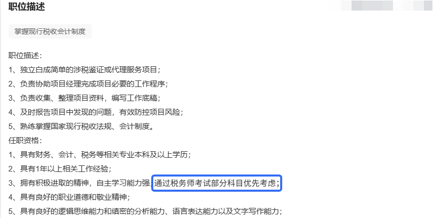 也就是说,想从事税务工作的你,如果通过了部分科目或是符合应聘岗位所看重的某一科目,就具备了优先竞争意向工作的机会。