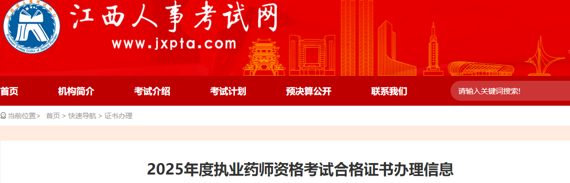 2026年1月6日,江西省人事考试网发布了“2025年度执业药师资格考试合格证书办理信息”,2025年江西执业药师资格考试合格证书于1月6日开始发放,请及时领取。详情如下: