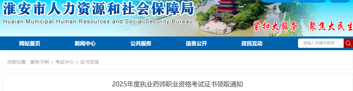 2026年1月4日,淮安市人事考试中心发布了“2025年度执业药师职业资格考试证书领取通知”,通知提到:2025年度执业药师职业资格考试证书已到,请考试合格的考生尽早领取。详情如下: