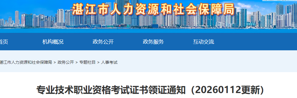 2026年1月12日,湛江市人力资源和社会保障局更新了“专业技术职业资格考试证书领证通知”,通知中提到:2025年广东湛江执业药师证书已可以领取,请相关考试合格人员抓紧时间领取证书。详情如下: