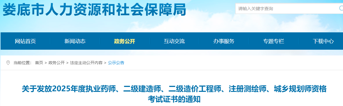 根据娄底市人力资源和社会保障事务中心发布的“关于发放2025年度执业药师、二级建造师、二级造价工程师、注册测绘师、城乡规划师资格考试证书的通知”,2025年湖南娄底执业药师证书领取时间为2025年12月30日起。原文详情如下: