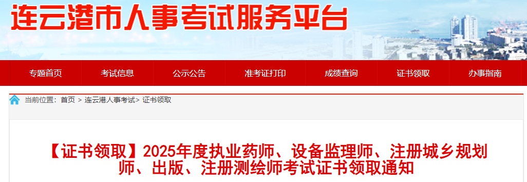2026年1月4日,连云港市人力资源和社会保障局发布了“【证书领取】2025年度执业药师、设备监理师、注册城乡规划师、出版、注册测绘师考试证书领取通知”,通知提到:2025年江苏连云港执业药师证书领取时间为2026年1月23日前。详情如下: