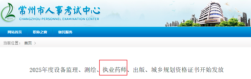 根据常州市人事考试中心发布的“2025年度设备监理、测绘、执业药师、出版、城乡规划资格证书开始发放”,2025年江苏常州执业药师证书已开始发放,请考试合格人员抓紧时间领取。原文详情如下: