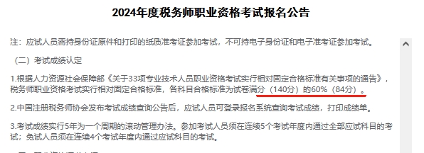 以下是《2024年度税务师职业资格考试报名公告》中关于2024年税务师考试分数合格线内容