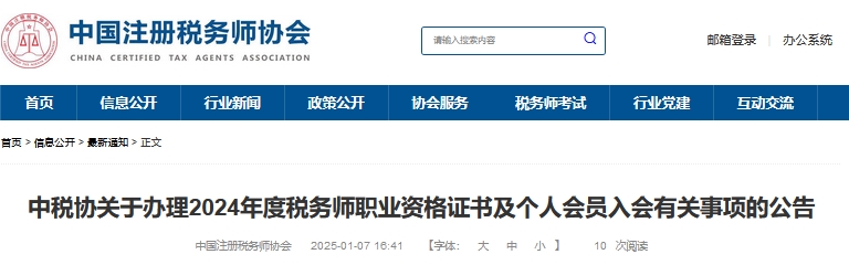 根据2024年度税务师职业资格证书办理及个人会员入会相关安排,现就有关事项公告如下: