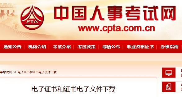 访问中国人事考试网(www.cpta.com.cn)首页,点击左侧菜单中的[电子证书下载]。