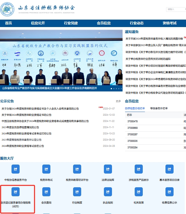 (一)申请加入山东省注册税务师协会的个人会员请登录山东省注册税务师协会官网(http://www.sdctaa.cn)至[会员登记服务事项办理指南(试行)]查看详细办理流程。