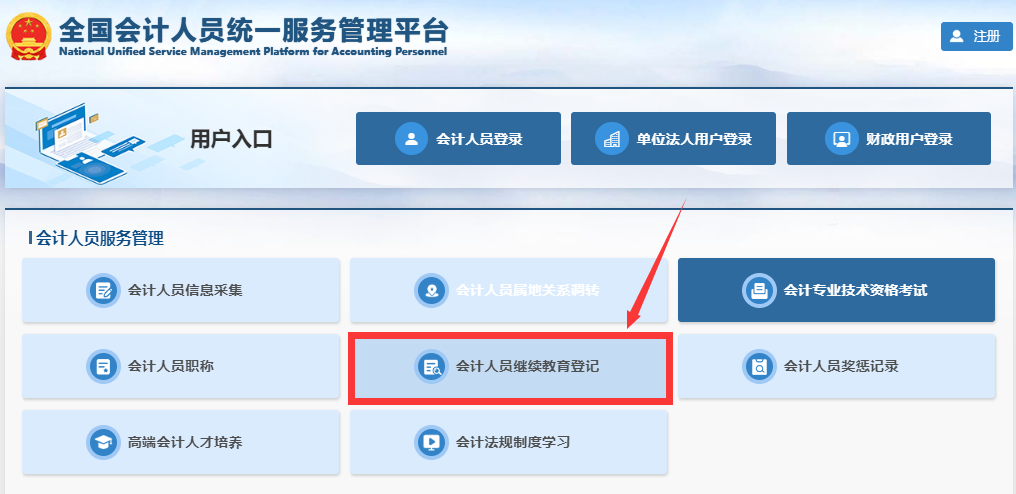 1.在全国会计人员统一服务管理平台选择“会计人员继续教育登记”;