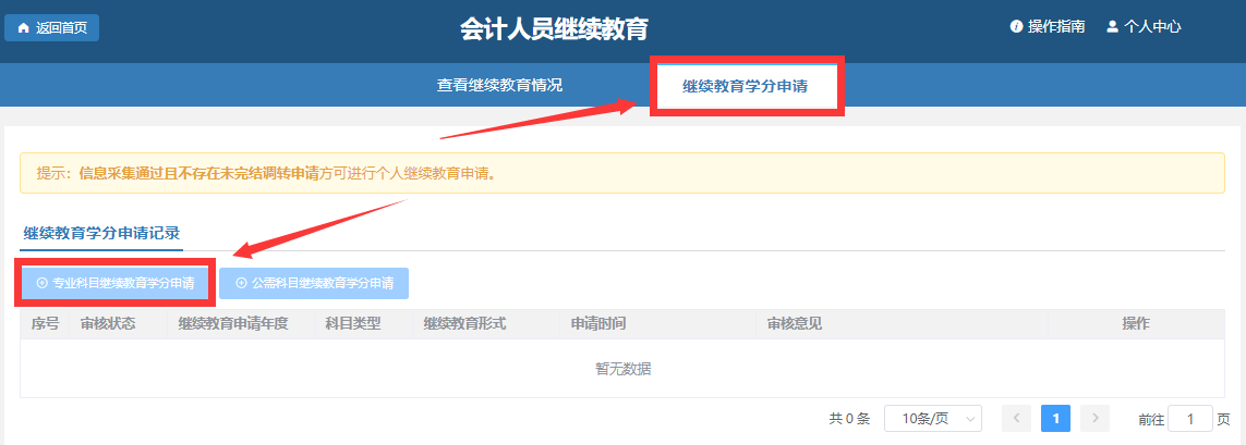 2.选择“继续教育学分申请”,选择“专业科目继续教育学分申请”;