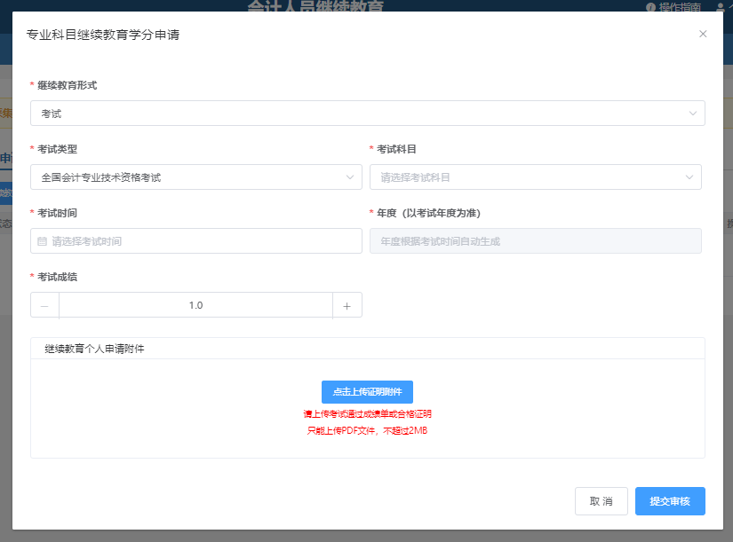 4.选择考试类型“全国会计专业技术资格考试”,选择通过的考试科目,填写考试年度,并上传证明材料(成绩单或合格证明),最后提交审核。