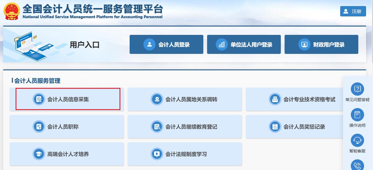 2025年中级会计职称报名信息采集入口为全国会计人员统一服务管理平台(https://ausm.mof.gov.cn/)。目前已开通,可随时进行信息采集,建议考生在2025年中级会计报名前完成,以免影响报名。