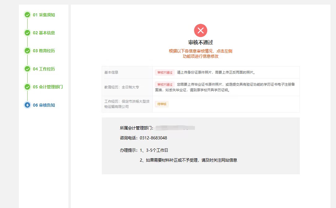 信息采集提交后审核不通过会给出修改建议,考生可以根据修改建议修改后重新提交,也可以拨打审核结果下方的所属会计管理部门的咨询电话咨询修改方法。如下图: