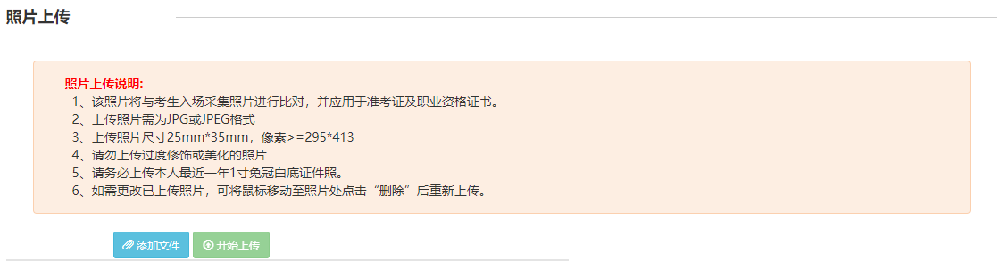 点击“添加文件”,调整成合适的尺寸后,点击“开始上传”;(格式不对的照片上传不了,并有相关提示,根据提示重新上传)