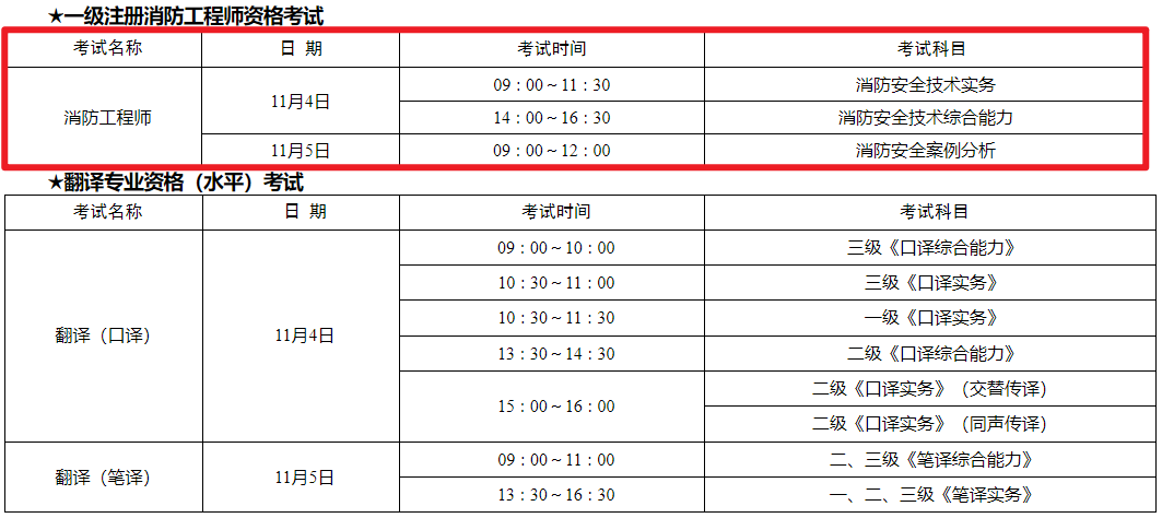 2023年度翻译、一级注册消防工程师考试将于11月4-5日举行。请考生按规定时间(翻译:10月30日-11月3日;消防工程师:10月30日-11月5日)登录原报名网站打印准考证,仔细查看考试时间、考试地点、考场号及座位号。以下相关注意事项,请关注!