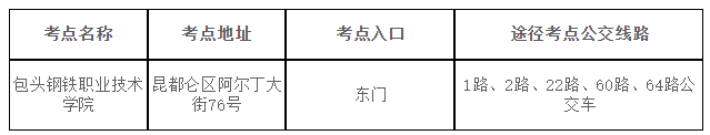 三、请提前熟悉考点地址、交通路线。本周考试考点设在包头钢铁职业技术学院。请广大考生认真阅读准考证上考点地址信息,提前了解考点入口位置和前往路线,做好考试当天的出行安排。考点院校禁止考生车辆、社会车辆进入校园,建议考生尽量乘坐公共交通工具或由家人送达等方式出行。为确保道路畅通,考试当天交管部门将在考点附近及道路沿线增派交警,请考生配合交警工作。