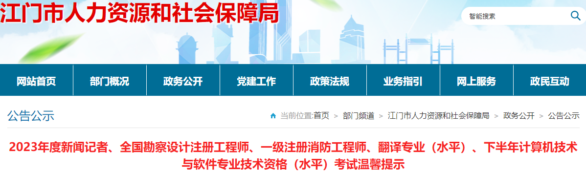 2023年度新闻记者、全国勘察设计注册工程师、一级注册消防工程师、翻译专业(水平)、下半年计算机技术与软件专业技术资格(水平)考试将于2023年11月4——5日举行。江门市人事考试院敬请江门考区广大考生注意以下事项: