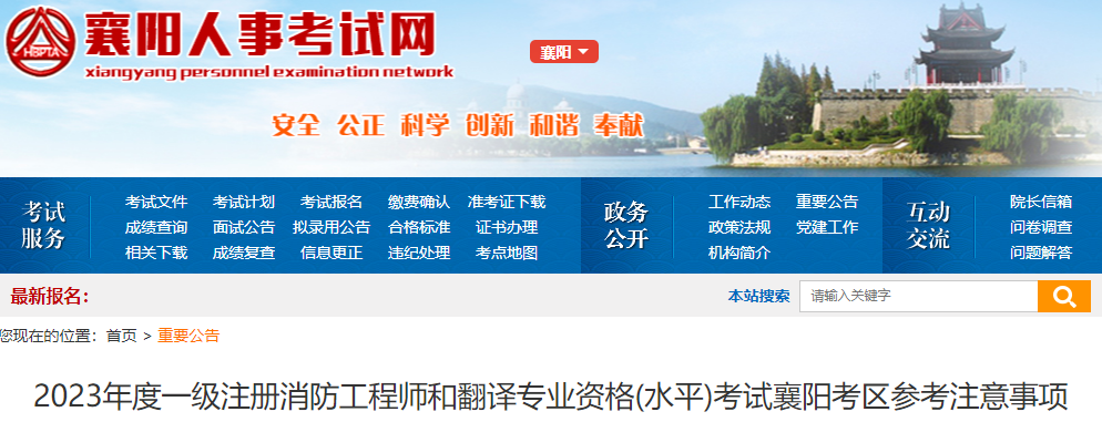 2023年10月31日,襄阳市人事考试网发布了《2023年度一级注册消防工程师和翻译专业资格(水平)考试襄阳考区参考注意事项》,其中明确襄阳市2023年一级消防工程师考试在11月4日-5日举行,应试人员需注意时间安排、交通出行、参考注意事项等。