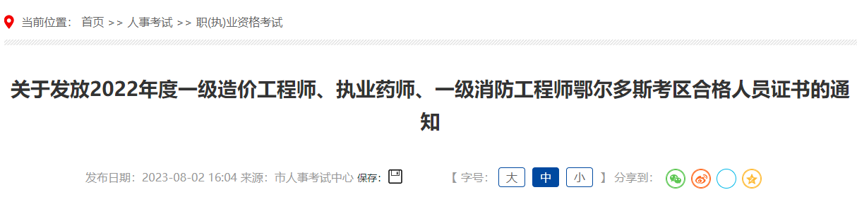 2022年度一级造价工程师、执业药师、一级消防工程师合格人员成绩已经公布,鄂尔多斯考区现开始发放合格证书。发放方式有现场领取和在应试人员自愿的基础上,由我中心提供证书邮寄两种方式。现将有关事项通知如下: