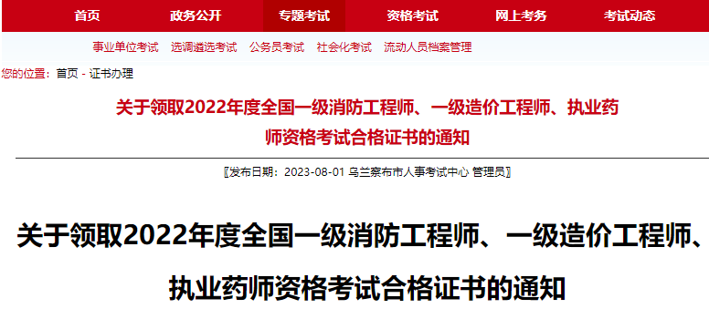 2023年8月1日,乌兰察布市人事考试中心发布了《关于领取2022年度全国一级消防工程师、一级造价工程师、执业药师资格考试合格证书的通知》,其中对2022年度一级消防工程师证书领取方式、时间、所需材料等信息作出具体安排。
